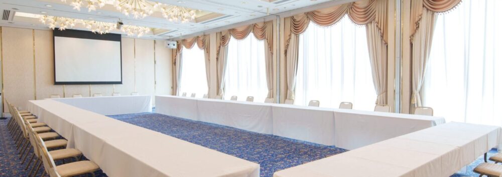 柔らかな色調と気品あるインテリアが特徴で、パーティーや会議、式典など幅広いシーンに対応。