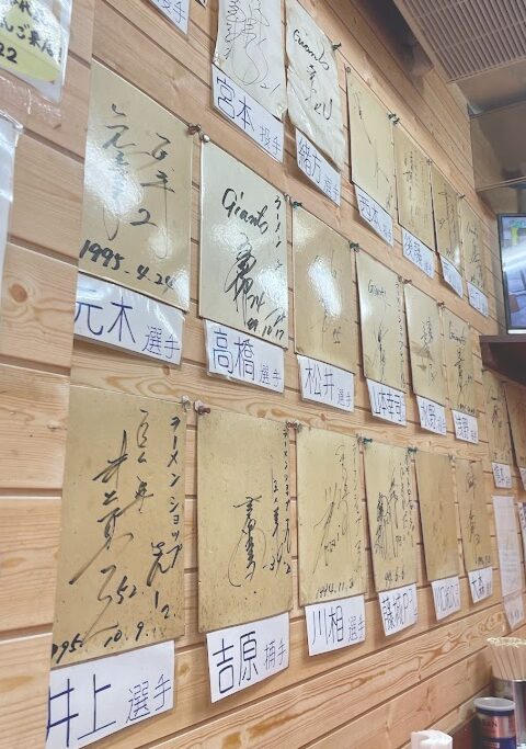 野球選手御用達のラーメン店のようで、壁にはずらっとサインが飾られています