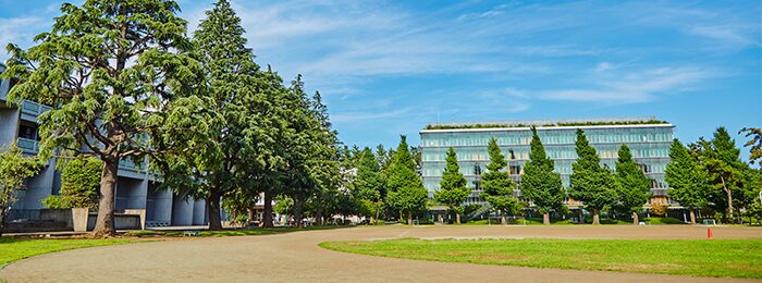キャンパスは自然豊かな環境に包まれており、校舎や庭園が落ち着いた雰囲気を醸し出しています。