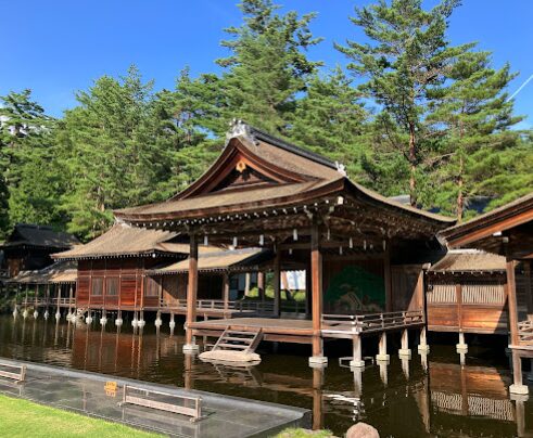 身曾岐神社(みそぎじんじゃ)の能楽殿は、神聖な空気の中で雅楽や能楽を上演する屋外舞台施設です。