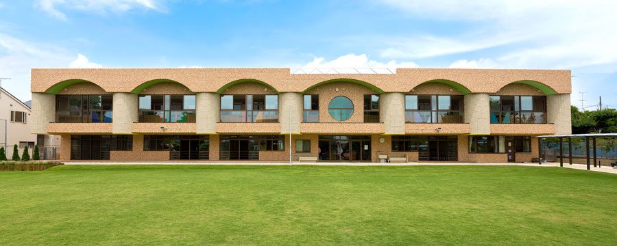 明るい園舎と季節の移ろいを感じられる広い園庭が特徴。
