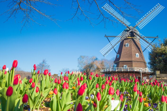 風車や花畑が広がる「メルヘンの丘ゾーン」をはじめ、動物と触れ合える広場や大型アスレチックなど見どころ満載。