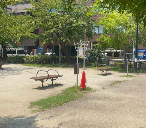 遊具やベンチが設置され、昼休みの休憩や親子連れの散歩にぴったりの公園。